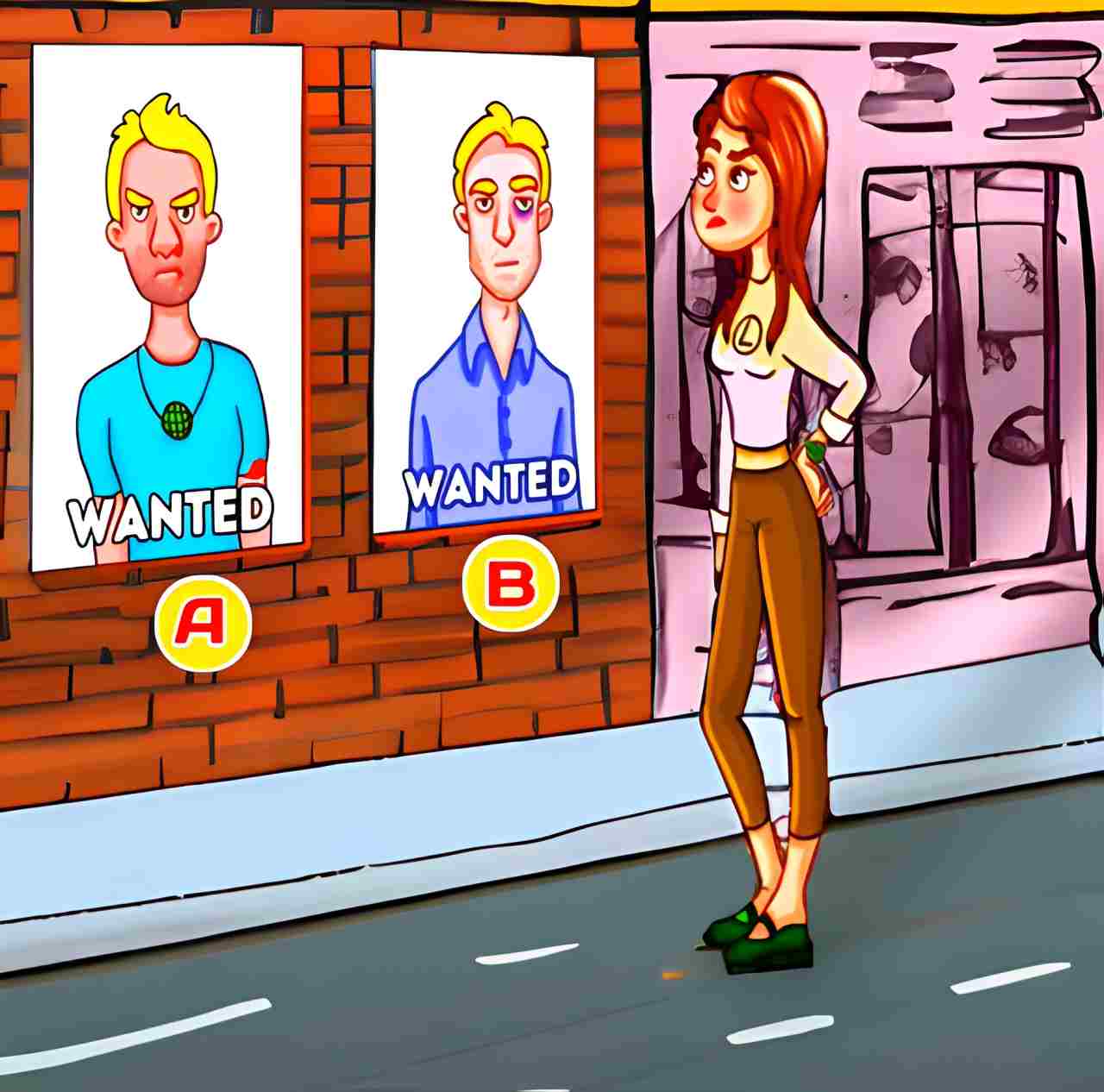 In the image above, a woman is standing in an alleyway. She is staring at the wanted poster of two men. The two men in the poster look rugged and scary. The woman is married and is looking for her husband. She has just recovered from amnesia and while passing through the alleyway, she came across the two posters. Looking at the two men reminded her of her husband, whose face she had forgotten. You have to find out who among the two men is her husband. You will have 4 seconds to solve this brain teaser puzzle. So, set your timers and get started. All the best.