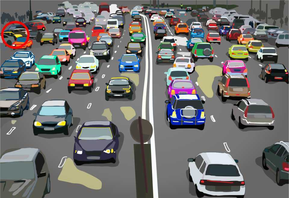 The way the yellow car has blended with the other vehicles makes it difficult to spot at first glance.