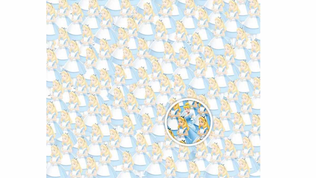 The image shows a non-uniformly divided collage of Alice. Your task is to find the image of Cinderella hidden in the picture. Now, divide the image into rows and columns, and use your skills like logical reasoning, observational power, and other abilities to solve this mental exercise.