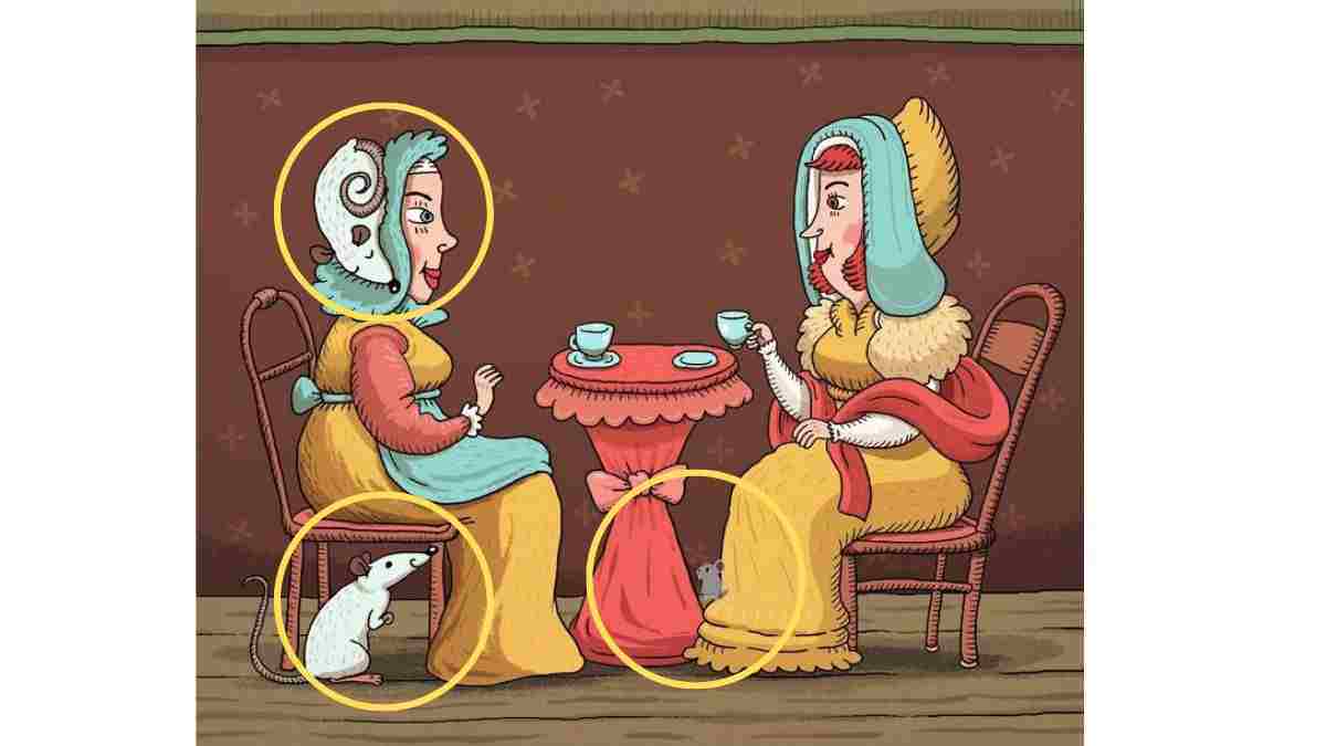 The picture shows two royal ladies enjoying their tea. And your task is to find the rats hidden in the picture. Go through all the corners and use your skills like logical reasoning, observational power, and other abilities to conclude this mental exercise.