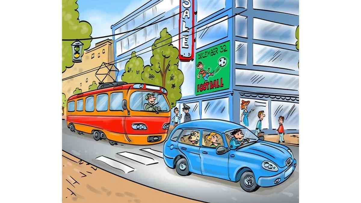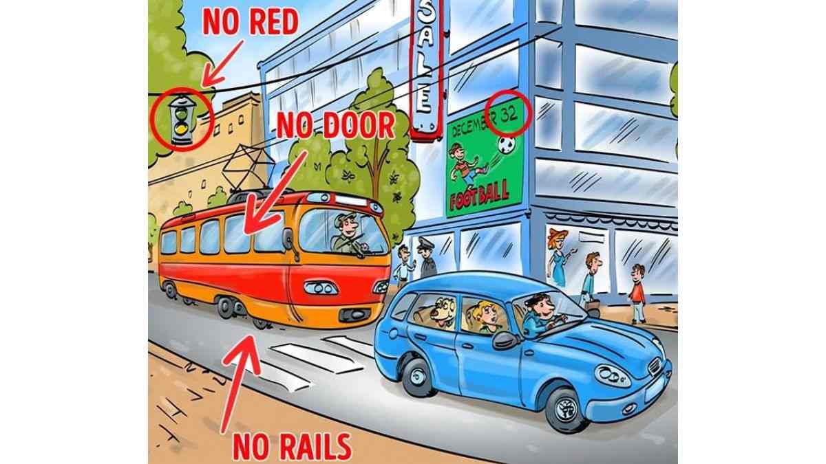 The picture shows a busy city street. And your task is to find all 4 hidden mistakes in the picture. Now divide the image into sections, go through all the rows and sections and use your skills like logical reasoning, observational power, and other abilities to conclude this mental exercise.
