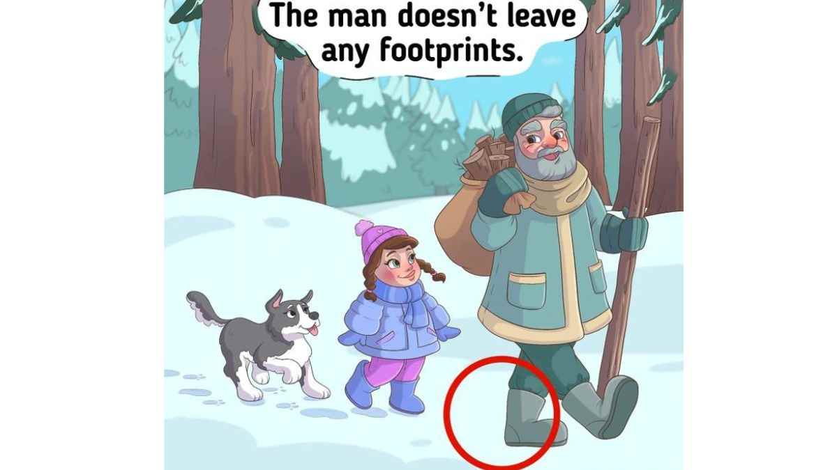 The picture shows an old man, a little girl and her dog. And your task is to find the hidden mistake in the picture. Divide the image into sections, go through all the corners, and use your skills like logical reasoning, observational power, and other abilities to conclude this mental exercise.