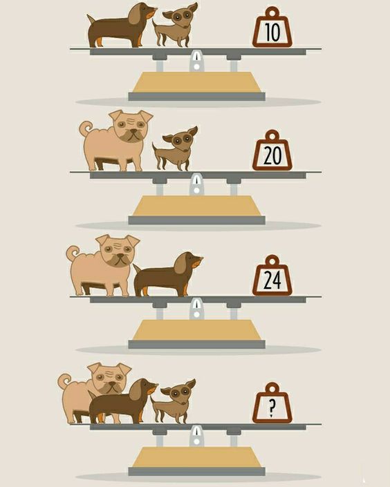 In this brain teaser picture puzzle, you have to find the weight of the three dogs as shown in the image above. You can see four weighing scales in this riddle. The first scale reads the combined weight of the two dogs- 20 kg, the second scale reads 10 kg, the third scale reads 24 kg, and the last scale’s measurement is up to you to figure out.
