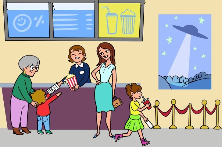 In this brain teaser picture puzzle, you can see a cinema hall where people are buying tickets to see a movie. If you take a closer look at the image, you will find that there are words scattered around the cinema hall. To be precise, there are four words hidden in the picture.