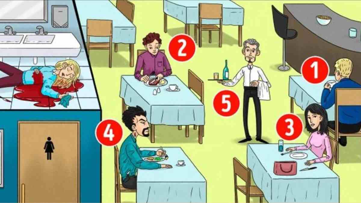 The picture shows a murder scene in a restaurant. And your task is to find the killer hidden in the picture. Now divide the image into sections, go through all the sections and use your skills like logical reasoning, observational power, and other abilities to conclude this mental exercise.