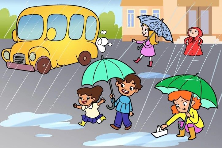 In this brain teaser, you need to spot all five words hidden inside the picture where the kids are enjoying the rainy day. Inside the picture, you can see that a few kids are playing under the umbrella and one kid is wearing a raincoat. A yellow bus has been parked on the road.