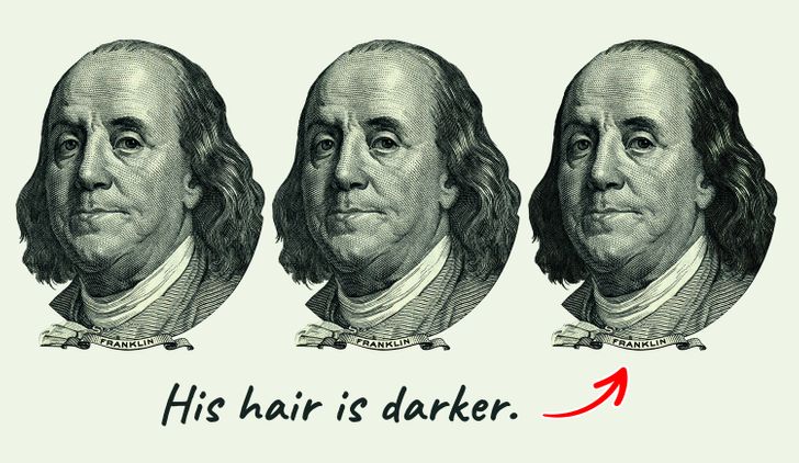 If you look at all three images of Franklin carefully, there is a very slight difference in one of the images of Franklin. All the Franklins have the same facial expression and features However, if you see the third image of Franklin, you will see that his hair is darker.