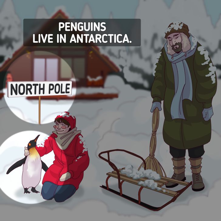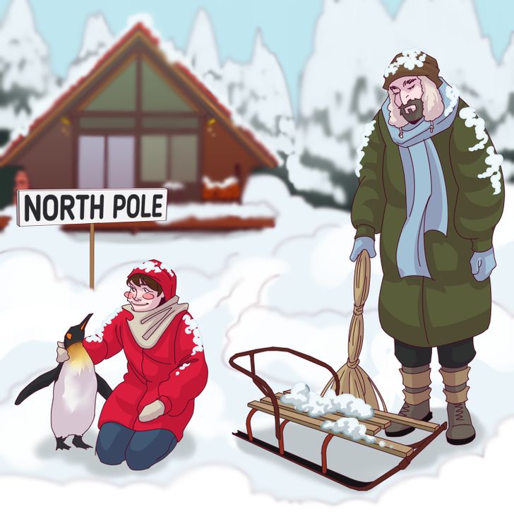 In the above image, you have to spot the mistake hidden inside the picture of the north pole region. Inside the snowy place, a man is standing with a broom along with a sled. A woman is sitting beside a penguin in the snow in the front of her house. However, there is a mistake hiding inside the picture.