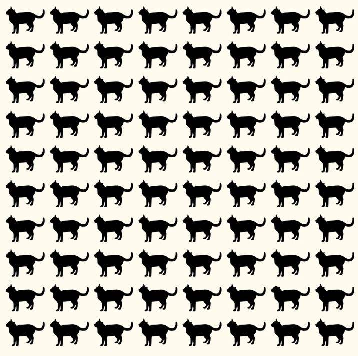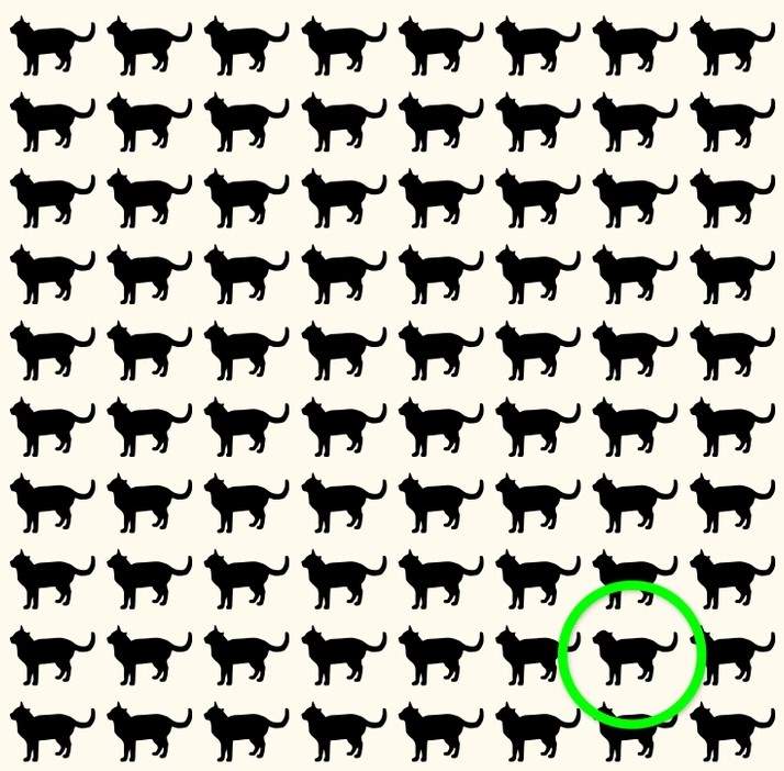 In this brain puzzle, you need to find out that one odd cat which is different from other cats in the group. There are 10 rows and 8 columns filled with similar-looking cats. To find the odd cat within 5 seconds you need to look quickly through all rows and columns. For your ease, we have highlighted the odd cat in the image given below: