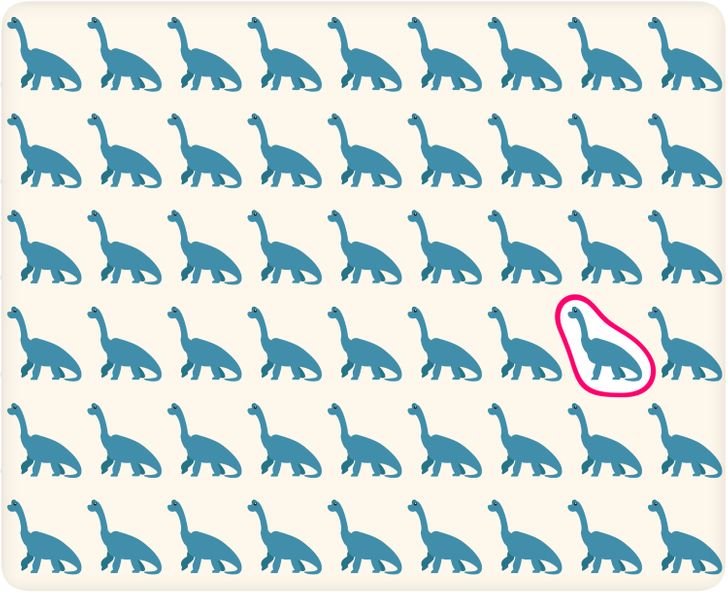 So, the answer to this mental quiz is that the odd dinosaur is in the 4th row and 8th column. The odd dinosaur has only three legs as compared to other dinosaurs who have four legs.