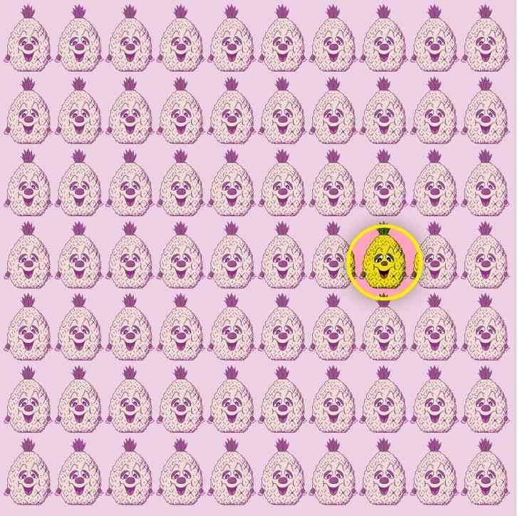 So, the answer to this mental puzzle is that the odd pineapple is in the 4th row and 8th column. The odd pineapple has a smaller nose as compared to other smiling pineapples in the group.
