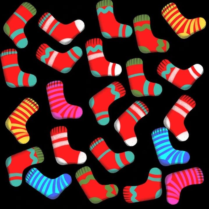 So, the answer to this mental quiz is that the sock on the top left side of the picture does not have its pair. Other socks have their pair inside the picture.