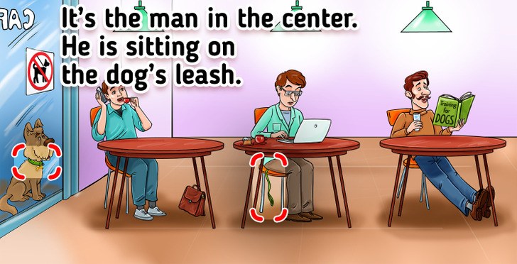 So, the answer to this mental quiz is the man sitting at the center of the room is the dog owner. If you look carefully, then you will be able to see that he is sitting on the dog’s leash.