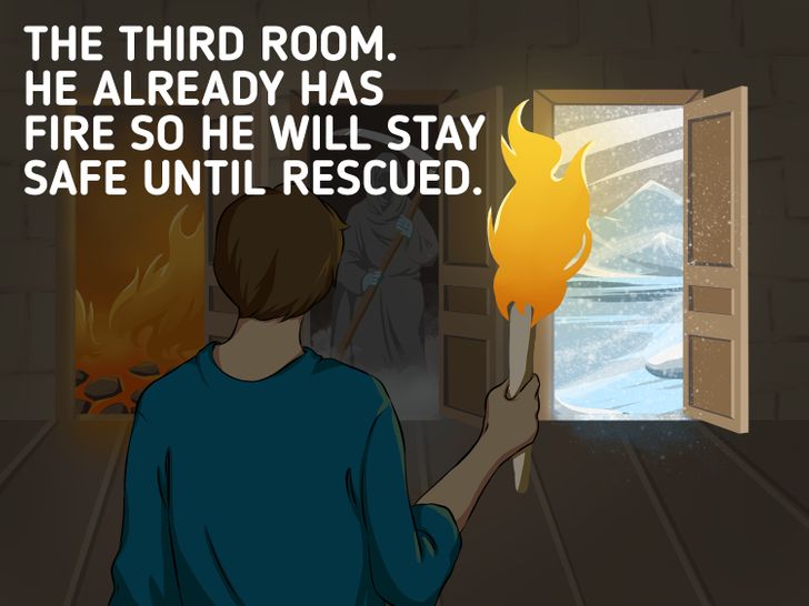 So, the answer to this mental quiz is that the third door is the safest exit through which the Man can escape without dying. There is an extreme cold temperature outside the 3rd Door. But the man already has fire, so he will stay safe until rescued.