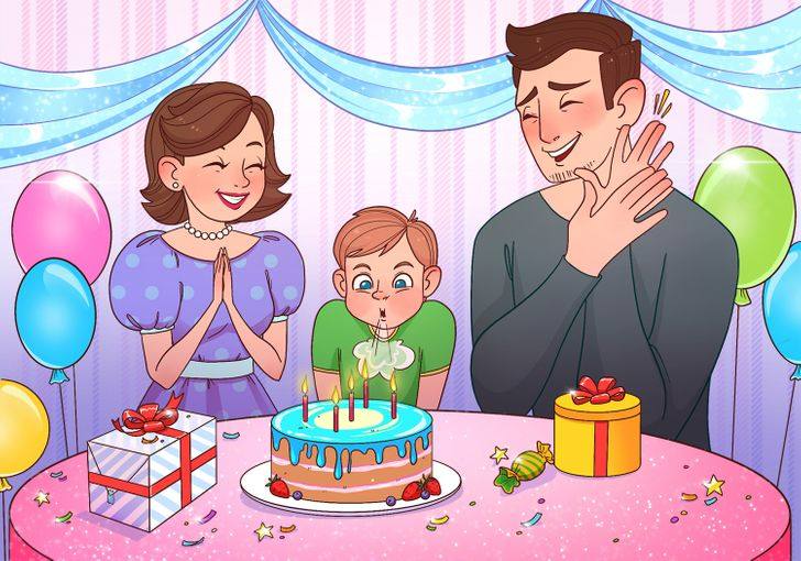 In the above image, you have to spot the mistake hidden inside the birthday Celebration picture. In the image, you can see that the couple is celebrating the birthday of their kid. The room has been decorated with balloons and presents have been kept on the table. The kid has made his wish and is now blowing the candles before cutting his birthday cake.