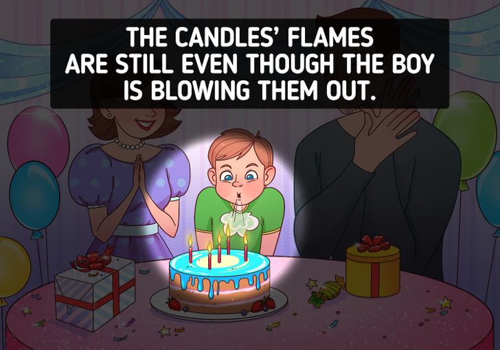So, the mistake in the picture are the candles’ flames. They are still even though the boy is blowing them out.