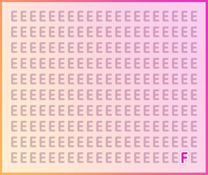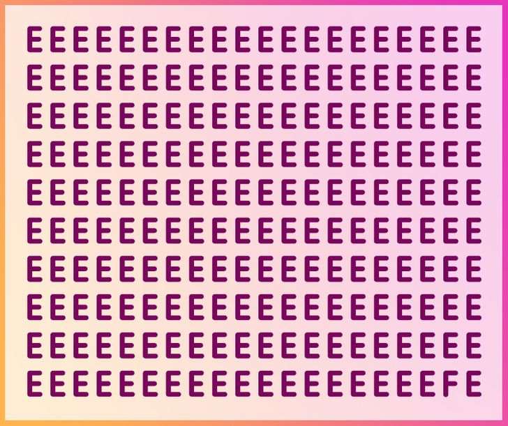 In this brain puzzle, you need to find out the hidden F that has been hiding among the alphabet ‘E’. There are 10 rows and 20 columns of the alphabet ‘E’. To find the hidden F within 11 seconds you need to look quickly through all rows and columns.