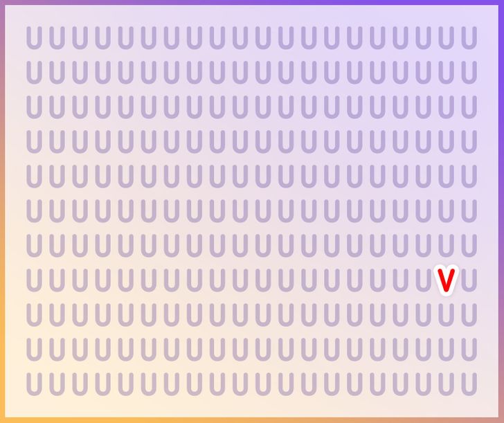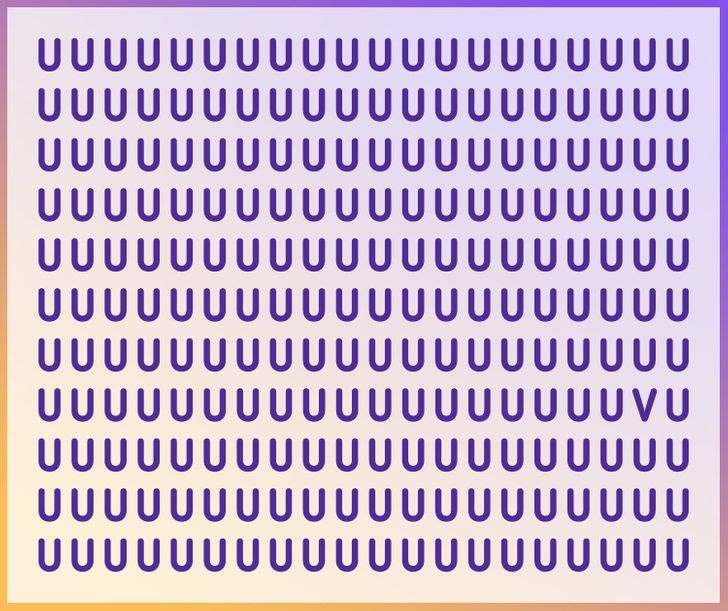 In this brain puzzle, you need to find out the hidden V that has been hiding among the alphabet ‘U’. There are 11 rows and 20 columns of the alphabet ‘U’. To find the hidden V within 11 seconds you need to look quickly through all rows and columns.
