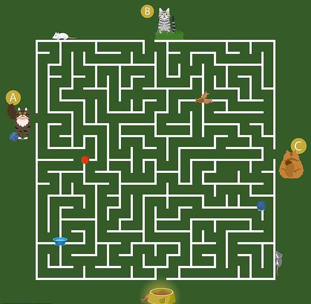 In the picture shared above, a maze is seen with three cats labelled A, B and C sitting on three ends. On the fourth end is a bowl of food. They need to traverse the maze to reach the bowl of food.