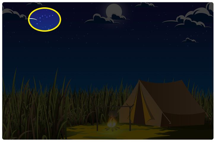 In this brain teaser picture puzzle, you can see a large field, a bonfire, and a tent set up. The moon is shining brightly and the stars are twinkling. However, even with the full moon’s luminosity, we cannot find one simple thing.