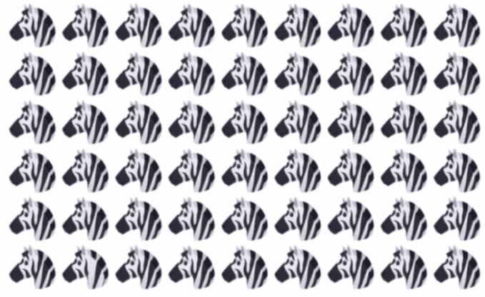 In this brain puzzle, you need to find out that one zebra which is different from the others. There are 6 rows and 9 columns filled with the side face of Zebras. To find the odd zebra within 10 seconds you need to look quickly through all rows and columns.