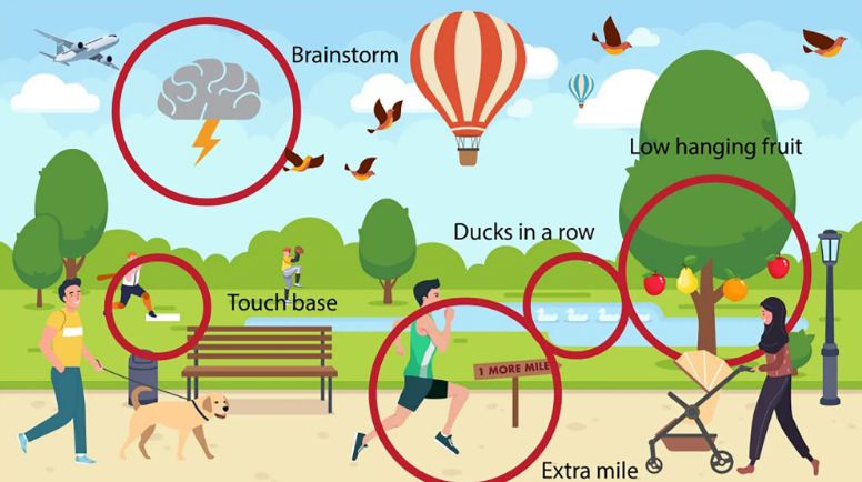 So, the five idioms that are hidden inside the picture are - brainstorm, touch base, ducks in a row, low-hanging fruit and going the extra mile.