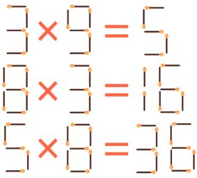 If we look at the 1st equation carefully, we can see that if we move one match from the 9 so that it turns out "3 x 3", and put it to the 5 on the right so that it becomes a 9, we get the correct equation: 3 x 3 = 9.