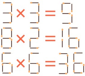Well, in the third equation, removing the match from the number 8 and attaching it to the five below, we get another fair equality: 6 x 6 = 36.