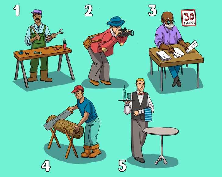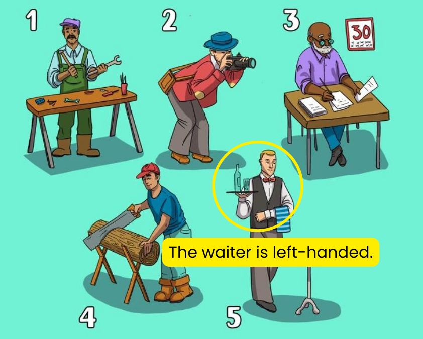 In the picture puzzle above, you can see 5 people in the frame. The first person is a mechanic, as indicated by the number of tools on this table, and he is holding a wrench in his hands. The second person is a photographer. He is holding a camera and clicking a picture of something. The third person is a professor as he is sitting and grading papers. The fourth person is a lumberman as he can be seen cutting a thick log of wood. The fifth person is a waiter as indicated by his attire and the tray of plates and glasses in his hand. One of these five people is left-handed. Can you find out who it is?