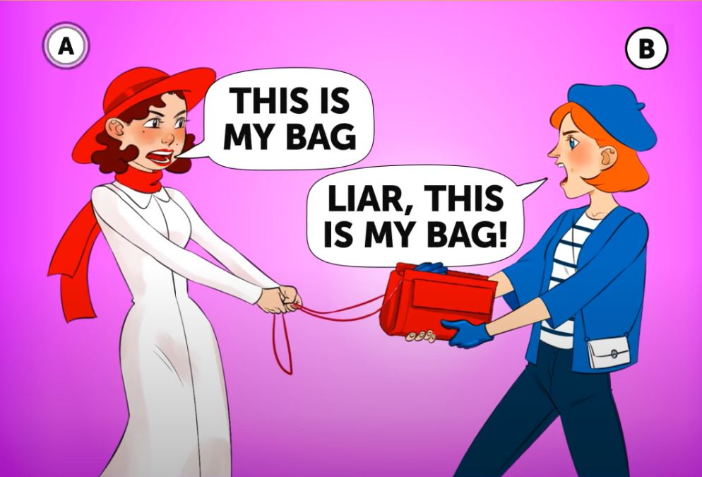 In the picture puzzle, you can see two women fighting. The woman on the right is wearing a white dress, a red scarf, and a red hat. The woman on the left is wearing a blue jacket, blue gloves, and a blue cap. The two women can be seen fighting over a red bag. Both women are claiming that the bag is theirs, but one of them is clearly lying. It is up to you to find out which one of them is lying. The time limit that we have set for this brain puzzle is 5 seconds. So you have to find out who is the real owner of the bag in just 5 seconds. Set your timers and get started. All the best, people.