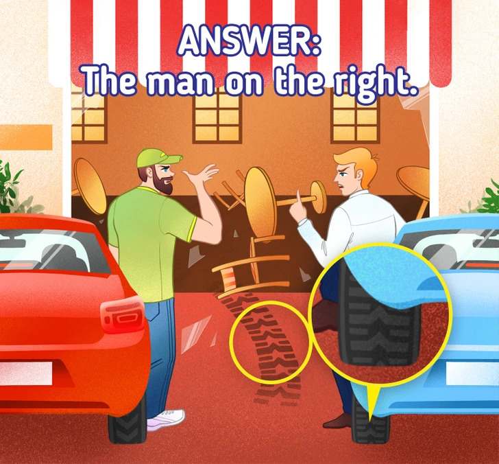 One of the two cars crashed into a restaurant, but no one knows which one. The car owners are fighting over the plausibility of who did it. There are tire tracks visible in this picture puzzle. Now, it is your job to find out who of the men is lying. The time limit that we have set for this brain teaser puzzle is 6 seconds. Set your timers and get started. Also, you will only be able to solve this puzzle if you have a detective’s brain. So, take this puzzle as a sort of fun way to find out whether or not you are fit to be a detective.