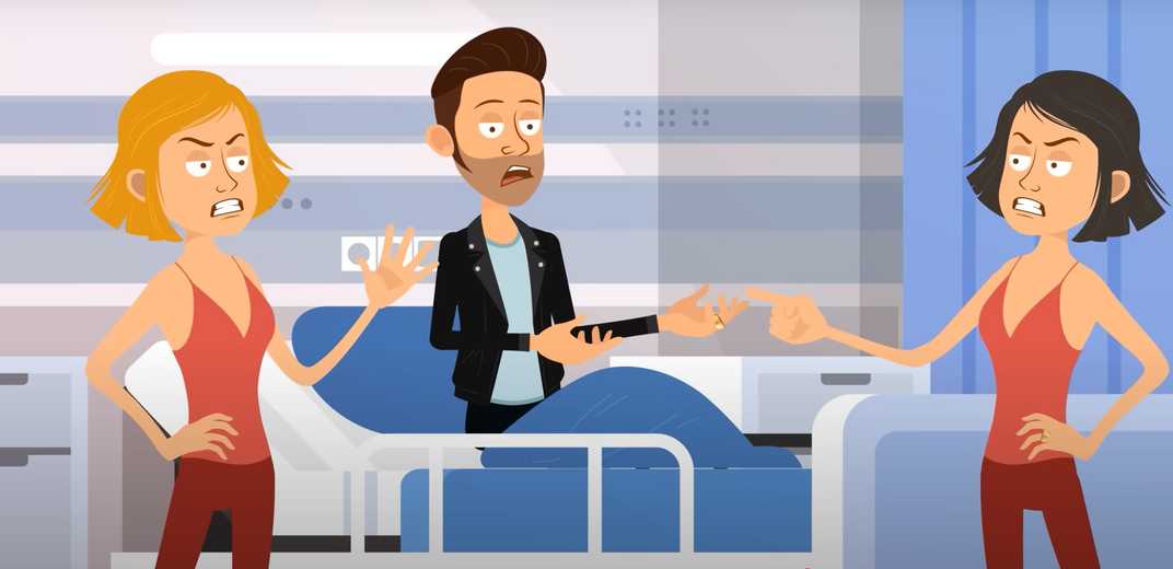 A hospital scene is depicted where a man is sitting on a bed and two women are beside him, claiming to be his wives.
