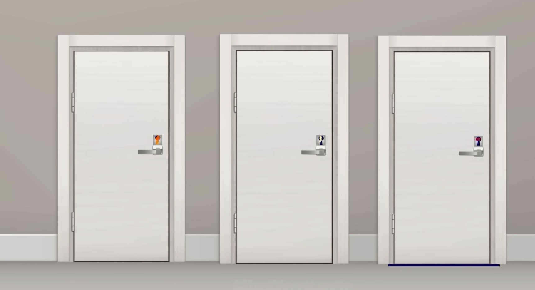 The correct answer is the door on the extreme right side of the image, if you zoom in, you can see that it has exit written on it.