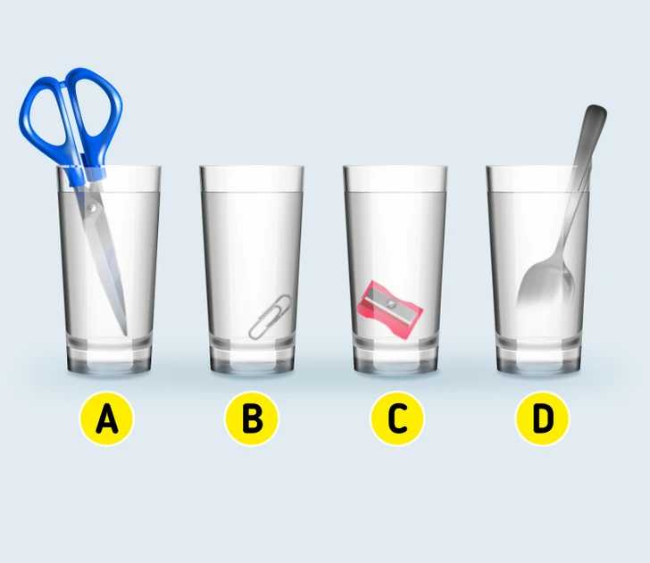 The glass containing the paper clip holds the most water. The logic behind the solution to this brain teaser is that paper clip has the least weight among the objects in the picture and therefore the glass containing the paper clip holds more water.