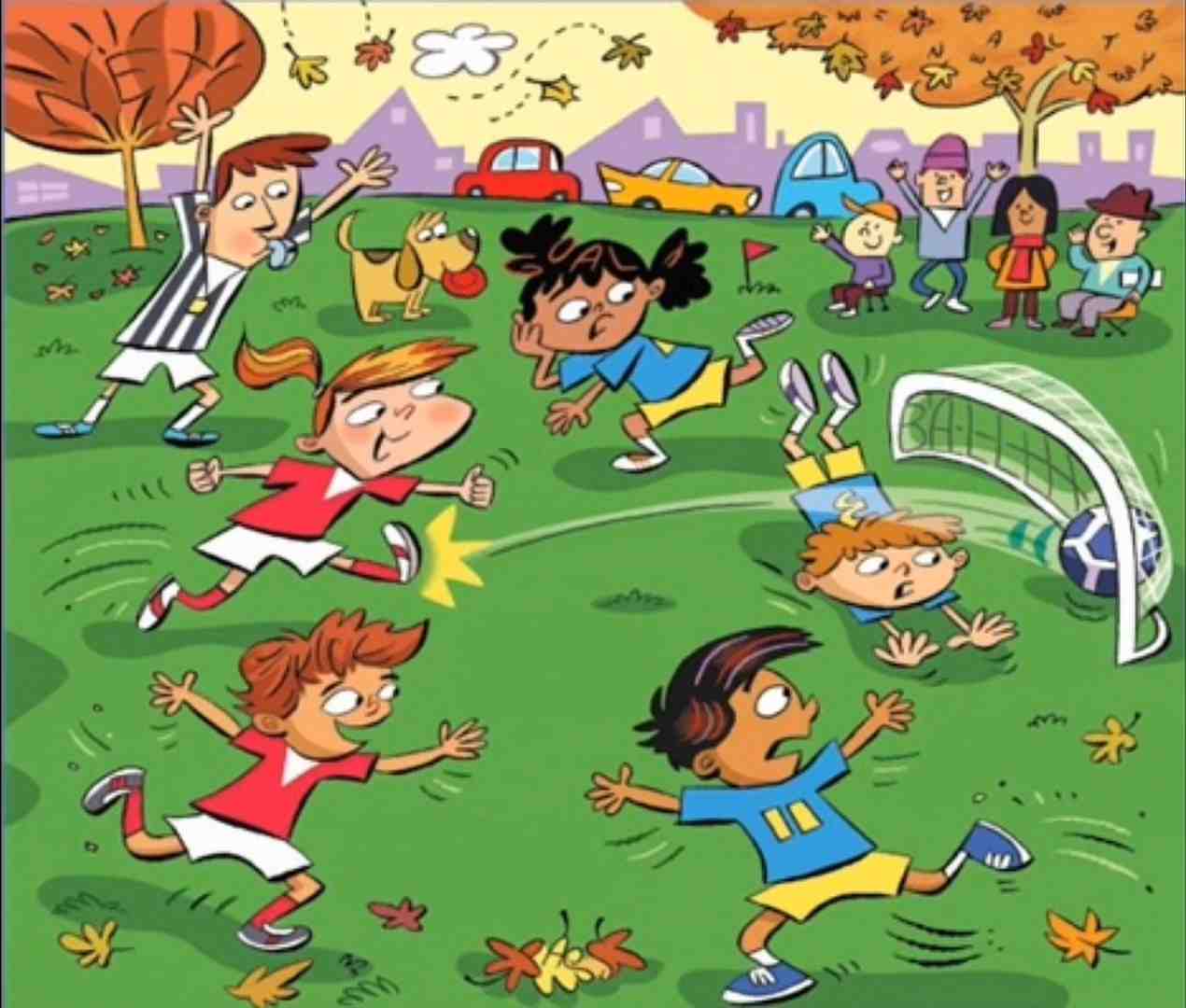 There are six children (and a dog) playing basketball in the image, and 4 children are cheering for them from the sidelines. There are 6 words related to the sport scattered throughout the image. You have to spot them all in 24 seconds or less.