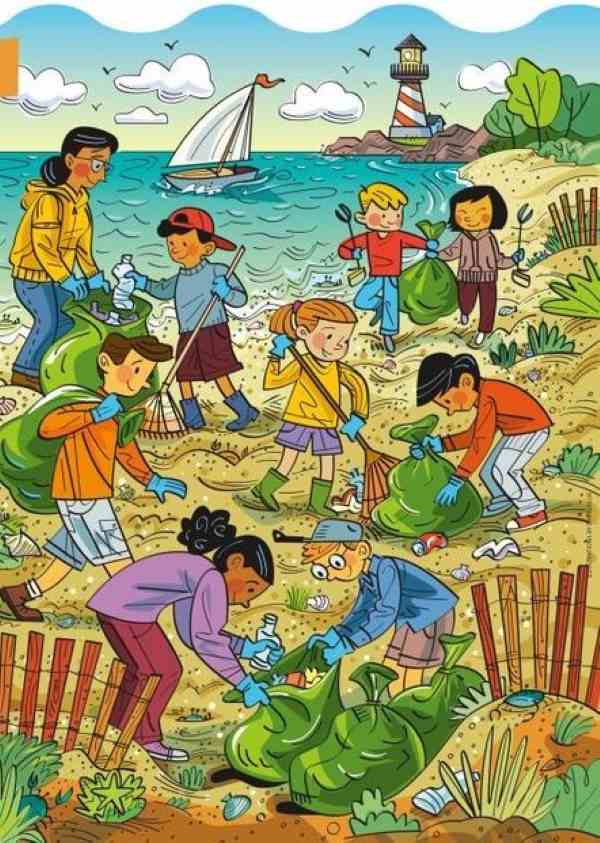 The image above features children cleaning up the shore of the beach and raising awareness about protecting the environment.