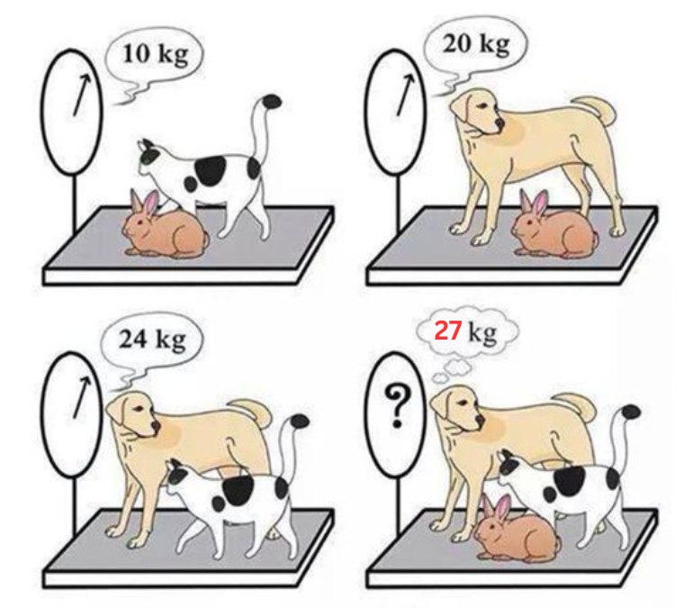 In the image above, you can see a cat, a dog, and a rabbit on weighing scales. The first scale reads the weight of the cat and the dog. Their combined weight is 10 kilogrammes.