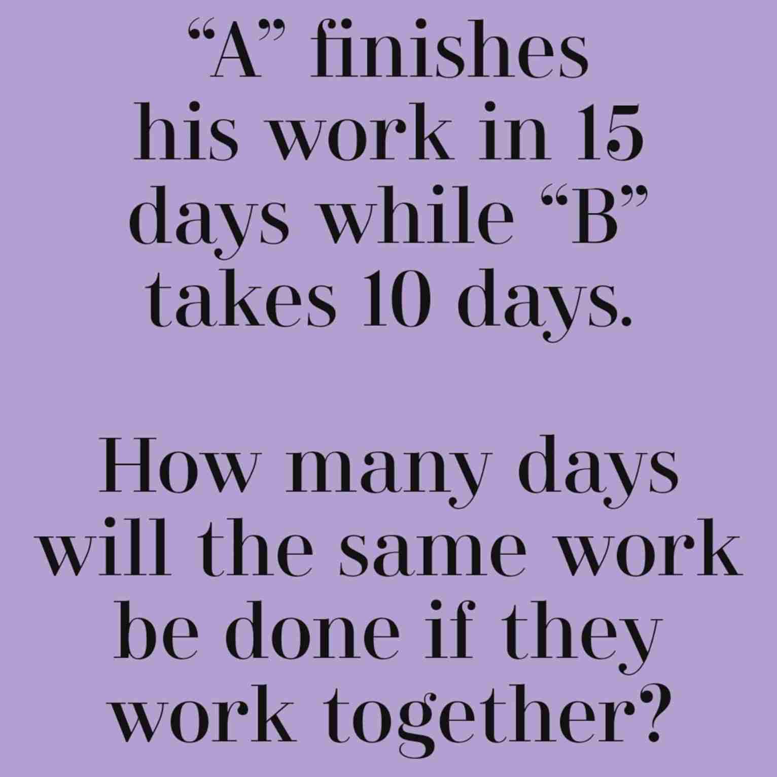 “A” finishes his work in 15 days while “B” takes 10 days. How many days will the same work be done if they work together?