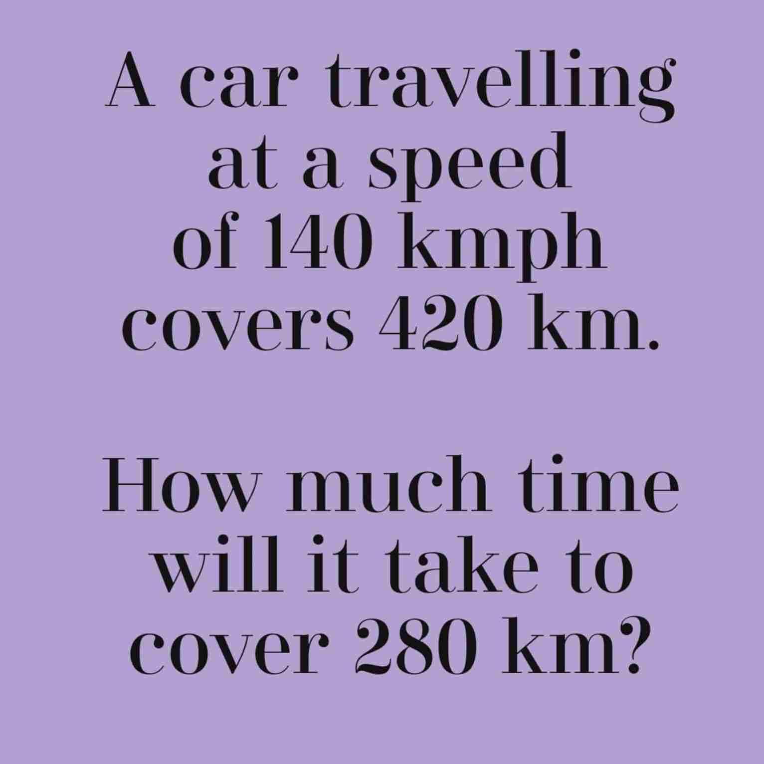 A car traveling at a 140 km/h speed covers 420 km. How much time will it take to cover 280 km?