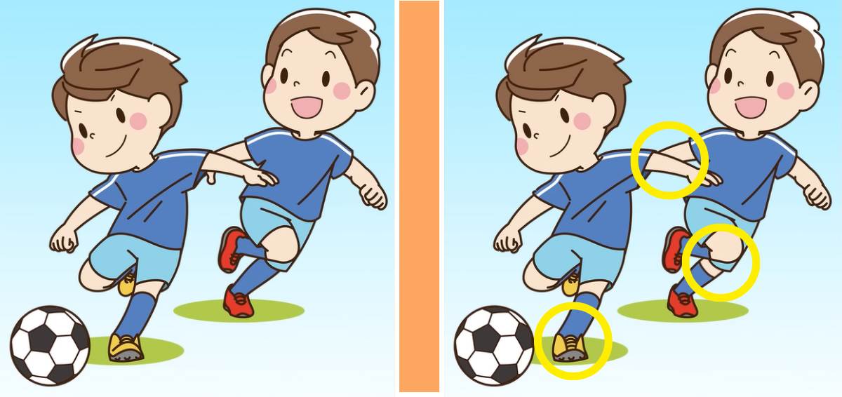 The image above depicts two identical pictures where you can see two boys playing football.. Although the images are nearly identical, there are 3 differences between them. Can you find them all in 6 seconds?