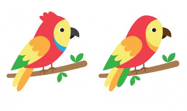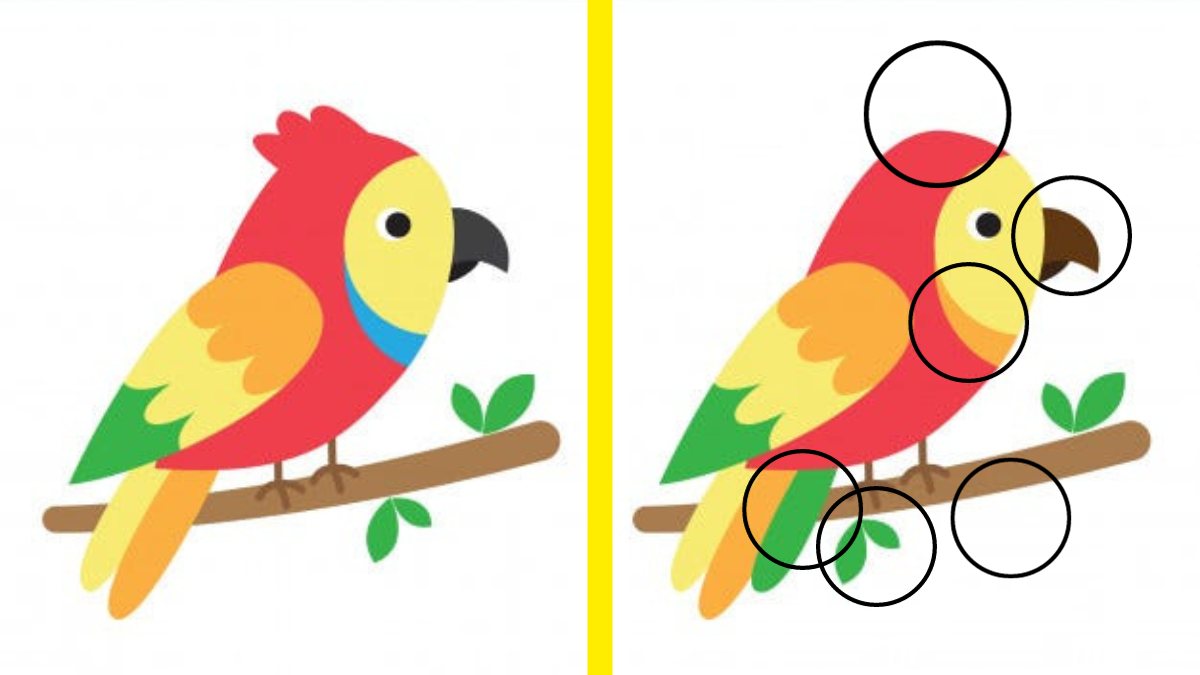 The image above depicts two identical pictures where you can see an adorable parrot on a tree branch. Although the images are nearly identical, there are 5 differences between them. Can you find them all in 15 seconds?