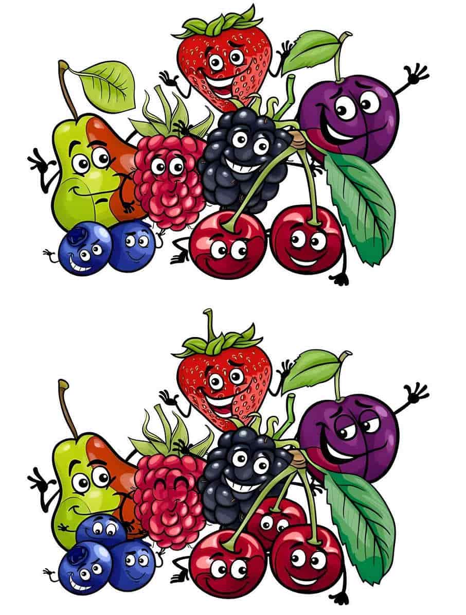 The image shared above shows two side-by-side pictures of various fruits like pear, blueberry, strawberry, orange, raspberry, black currant etc.