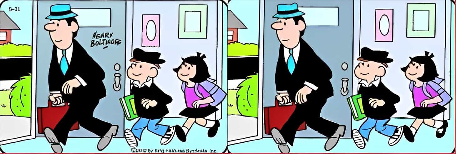 The image shared above shows a scene from the comic strip Dennis the Menace. You can see two identical images where Dennis can be seen walking across the room along with two other characters.
