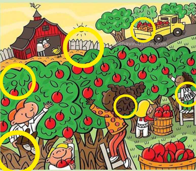 In the image above, you can see a farm. There is an apple orchard near the farm and you can see four children picking apples from the trees. There is also a barn where you can see a cow and on the road, there is a pickup truck carrying apples from the orchard. There are also six words scattered throughout in this farm image. You have to spot them all in 24 seconds or less. Finding the words hidden in this puzzle is fairly easy. All you have to do is observe the image really carefully, and you will solve this puzzle within the given time.