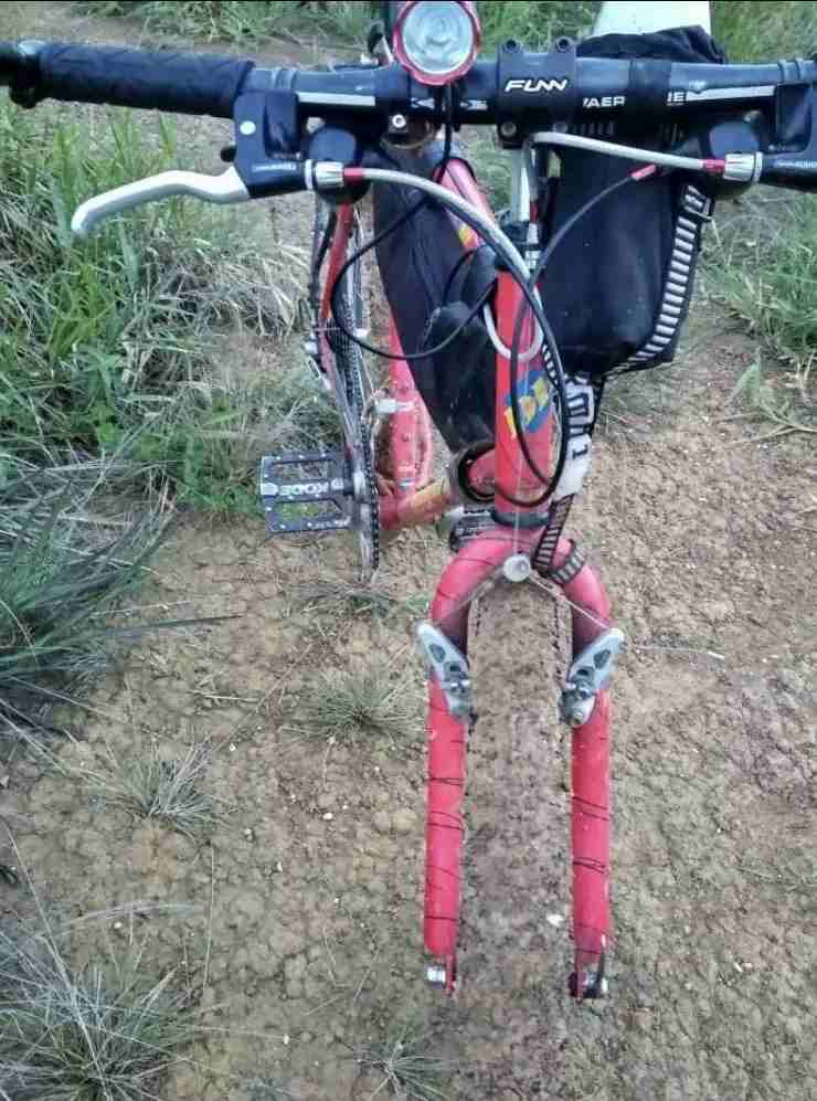 At first glance, it is not possible to identify the bike tires due to the fact that the tires are covered completely in mud, thereby masking its actual structure and making it invisible to our eyes.