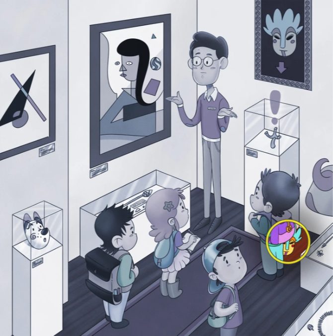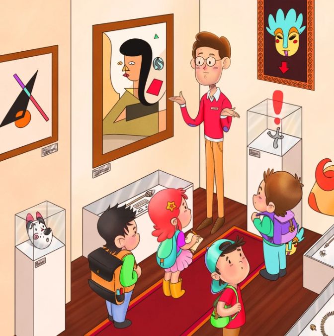 Since this is a test of your observation skills, observe the image really carefully. Look at the children, look at the museum guide, look at the glass displays and see if you can spot any mask-shaped silhouettes anywhere.
