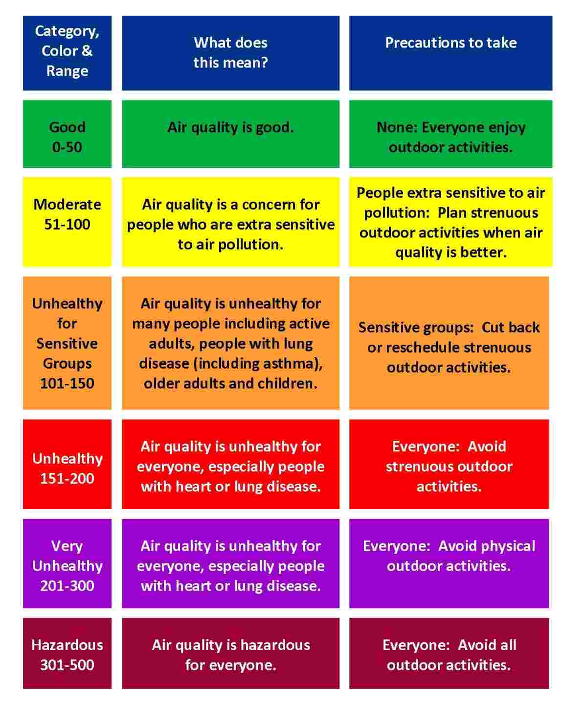| Red | Unhealthy | 151-200 | Health effects may occur for the general public, but more serious effects for sensitive groups. |