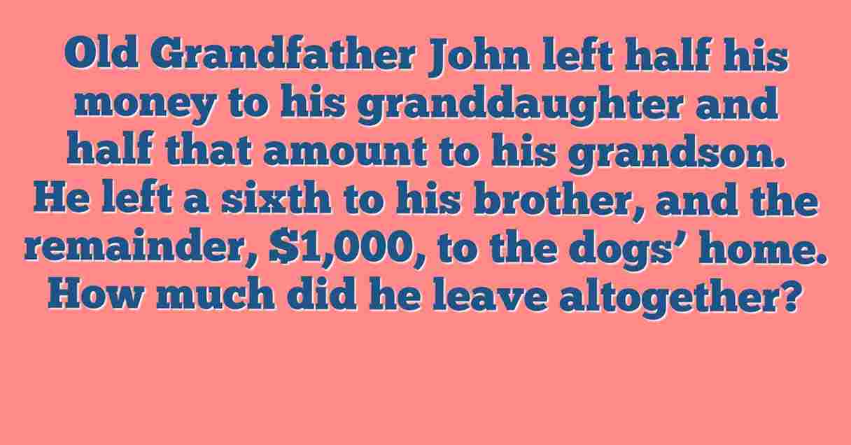 Old Grandfather John left half his money to his granddaughter and half that amount to his grandson. He left a sixth to his brother, and the remainder, $1,000, to the dogs’ home. How much did he leave altogether?