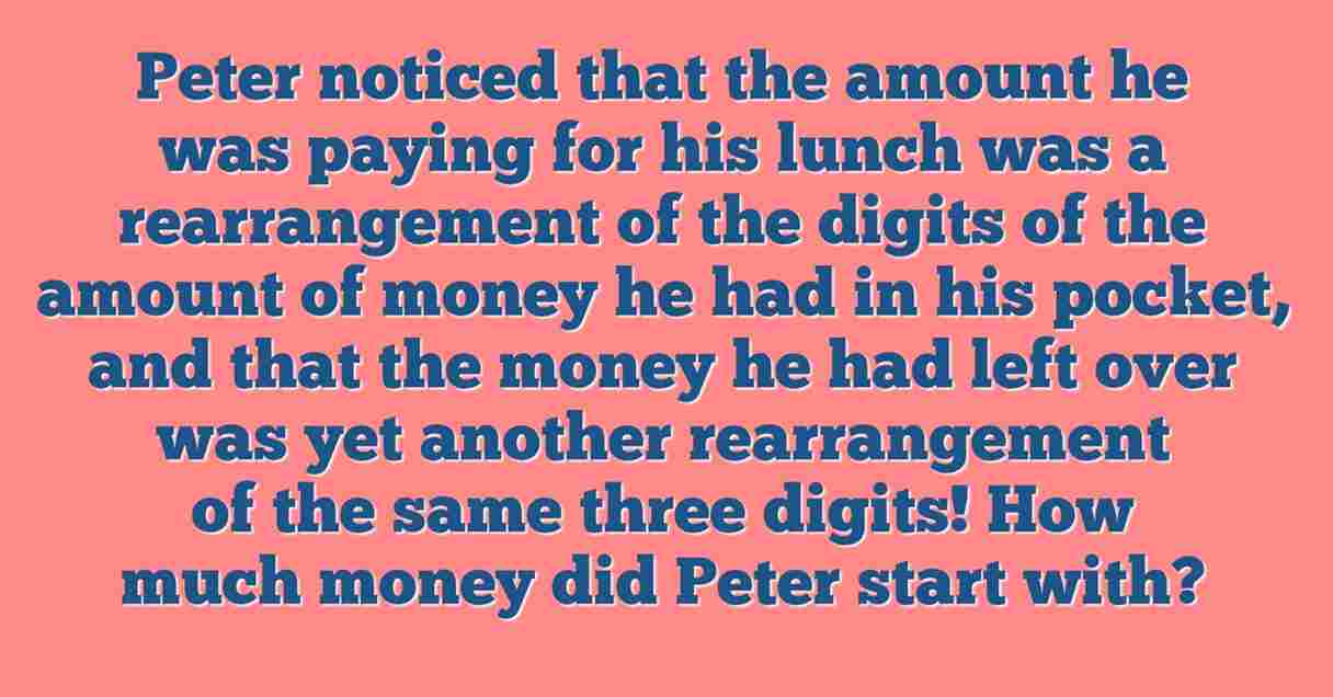 Peter noticed that the amount he was paying for his lunch was a rearrangement of the digits of the amount of money he had in his pocket and that the money he had left over was yet another rearrangement of the same three digits! How much money did Peter start with?