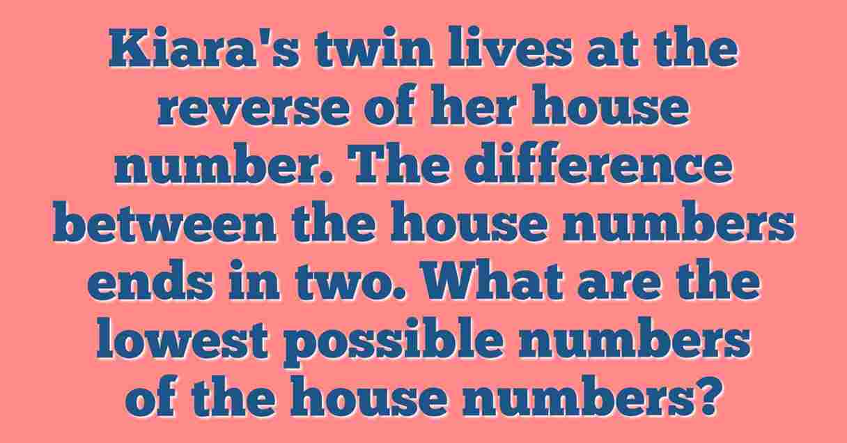 Kiara’s twin lives at the reverse of her house number. The difference between the house numbers ends in two. What are the lowest possible numbers of the house numbers?